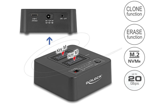 Delock M.2 Докинг станция за 2 x M.2 NVMe, клониране,изтриване, до 20 Gbps, USB-C, адаптер